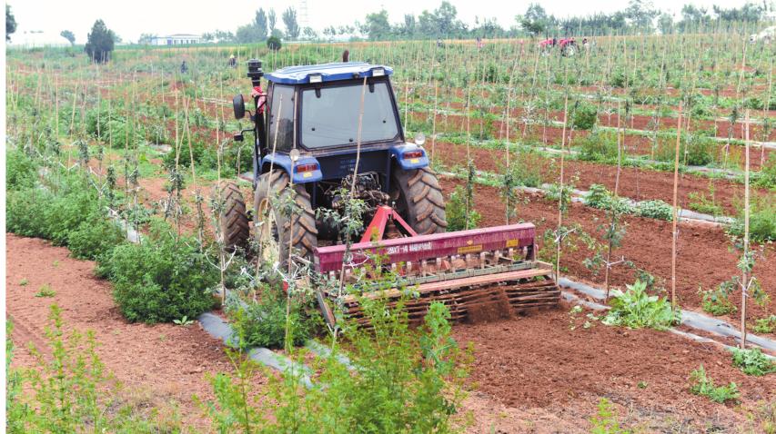 6月19日,在麟游县九成宫镇桑树塬村万亩有机苹果产业扶贫示范基地里,务工人员正驾驶农机犁地翻耕除草。陕西果业集团麟游有限公司投资4.32亿元在麟游县建设万亩矮砧有机苹果产业扶贫示范基地。基地建成后,年产值可达1亿元以上,并带动常丰、九成宫、崔木、丈八4个镇18个村发展优质有机苹果产业8万亩以上。